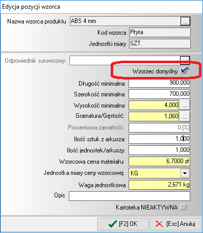 W celu zakończenia definicji wzorca materiału należy ustawić znacznik "Wzorzec domyślny"