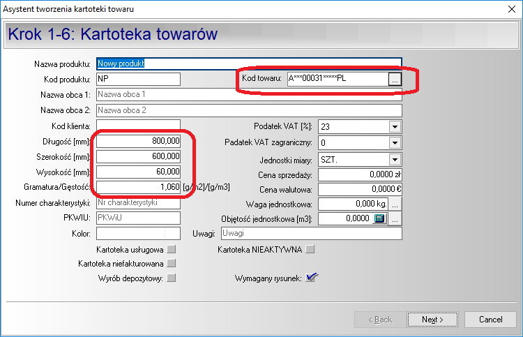 Generowanie produktu oraz wycenę materiałową rozpoczynamy od definicji kartoteki produktu. Ważnym jest aby ustawić odpowiedni rodzaj materiału, co skutkuje ustawieniem pola gęstości. Dodatkowo należy wprowadzić wartości rozmiaru produktu.