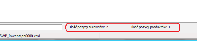 Dodatkowo w panelu u dołu okna, umieszczona został a informacja o aktualnym stanie ilościowym pozycji w arkuszu. Informacja podzielona została na magazyn surowcowy i produktów.