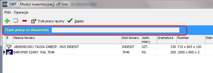 Po przełączeniu programu w tryb pracy ze skanerem w oknie głównym pojawi się panel z polem odczytu kodu kreskowego.