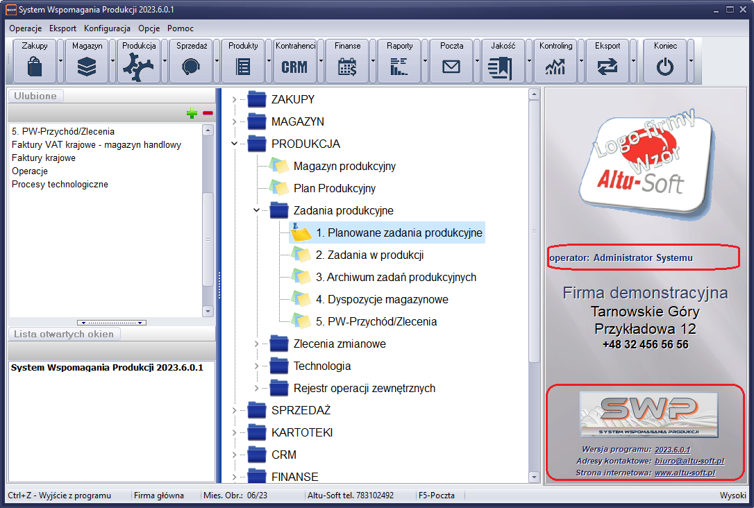 Logo firmy u dla której została wykupiona licencja systemu (w przypadku wersji demo wyświetlane jest logo przykładowe) oraz dane firmy wyświetlane są na panelu w prawej części głównego okna systemu. Dodatkowo panel zawiera informacje o aktualnie pracującym w systemie użytkowniku oraz informacje w postaci adresu e-mail oraz strony internetowej służące do komunikacji z producentem systemu.