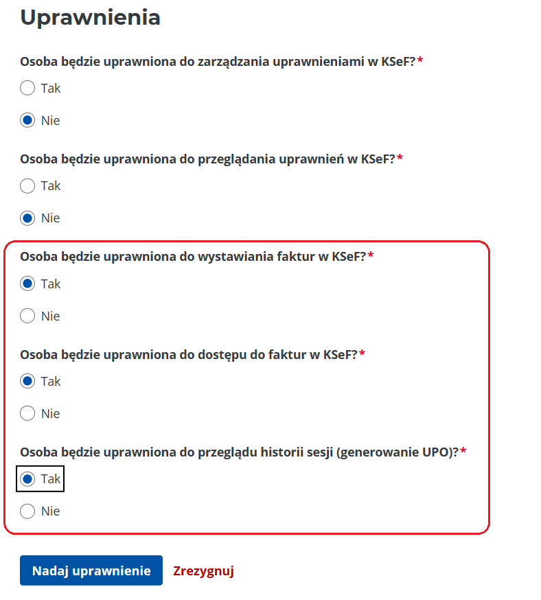Po uzupełnieniu formularza przechodzimy do opcji „Uprawnienia”.