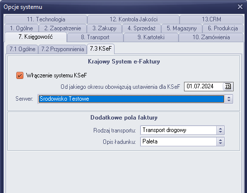 W sekcji „Księgowość”, zakładka „7.3 KSeF” wprowadzamy następujące opcje: