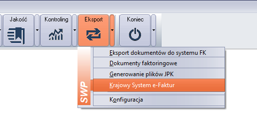 Na głównym ekranie programu w menu kontekstowym klawisza „Eksport”, dostępna jest opcja „Krajowy System e-Faktury”.