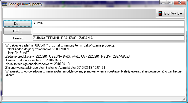 Rysunek 142 Informacja do właściciela zamówienia handlowego o dokonanej zmianie planowanego terminu dostawy wynikającego ze zmiany terminu zakończenia produkcji
