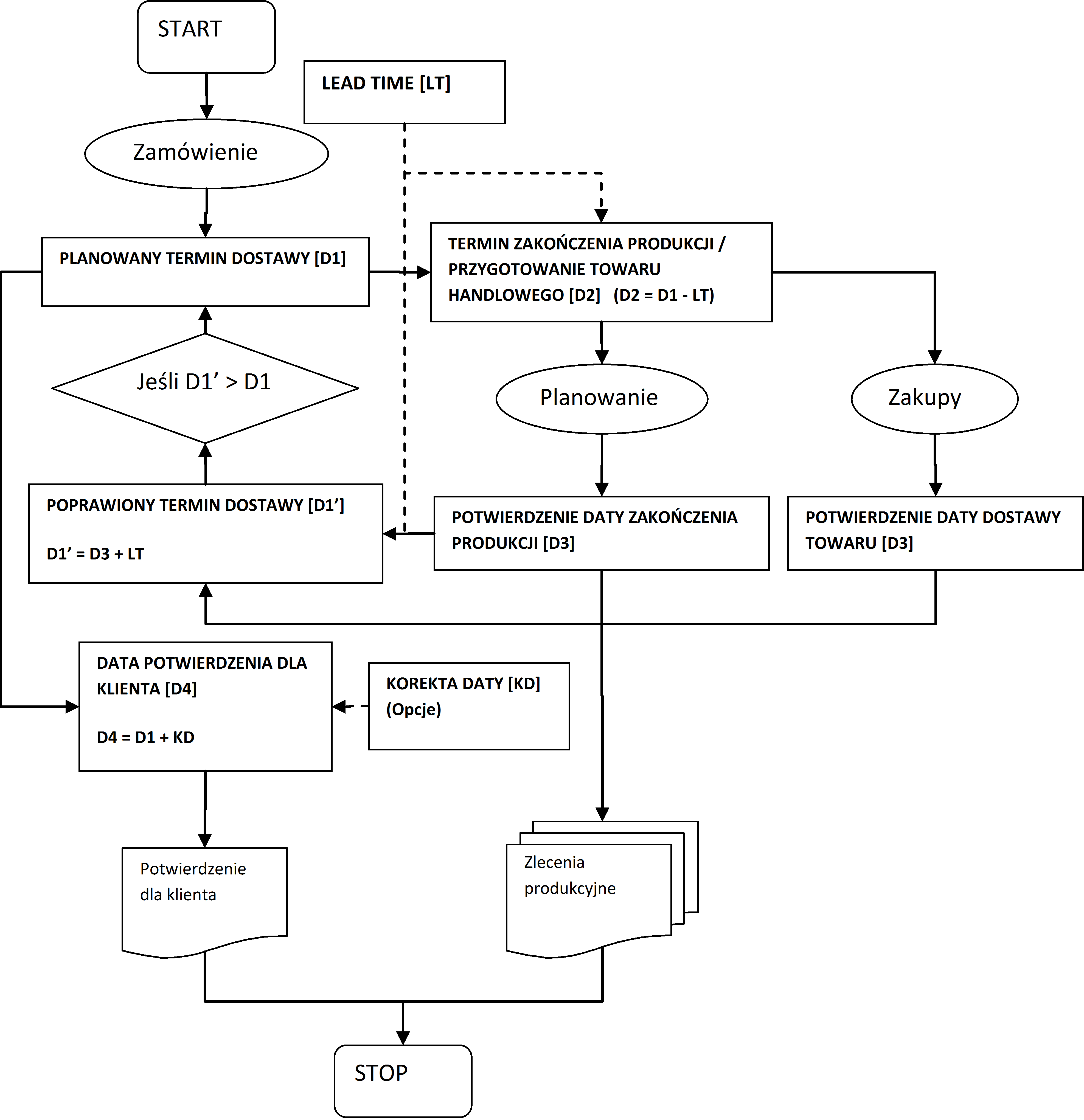 W pakiecie zadań produkcyjnych w poszczególnych pozycjach pakietu (w zadaniach produkcyjnych) widoczna jest kolumna "Termin zakończenia produkcji" (Jest to odpowiednik daty [D2] na schemacie blokowym). Początkowo termin ten obliczany jest na podstawie "Planowanego terminu dostawy" [D1], pomniejszony o wskaźnik Lead Time. Wskaźnik Lead Time ustawiany jest indywidualnie dla każdego kontrahenta.