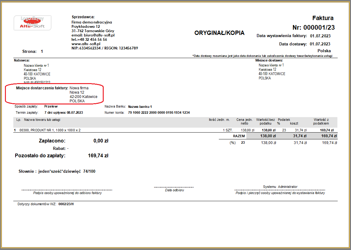 poniżej przedstawiono przykładowy wydruk faktury z naniesionym adresem dostarczenia faktury. Adres na dokumencie faktury pojawia się w momencie wypełnienia danych w kartotece klienta. Adres umieszczony jest bezpośrednio pod adresem miejsca dostawy towaru.