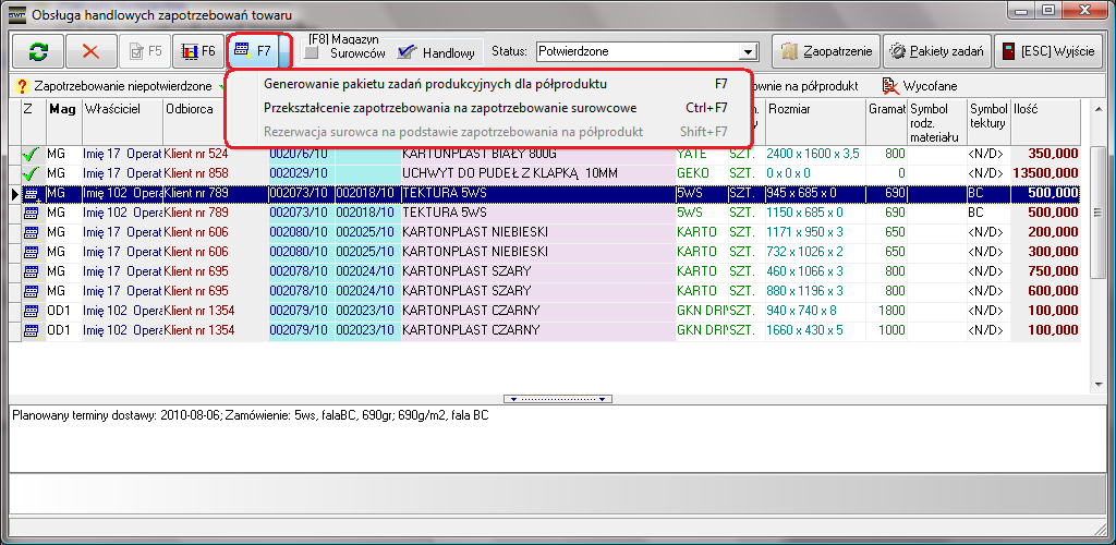 W przypadku gdy półprodukt będzie produkowany, należy wygenerować zadanie produkcyjne na półprodukt. Zadanie takie dodawane jest do już istniejącego pakietu zadań produkcyjnych, jeśli taki pakiet jest jeszcze w fazie produkcji. W innym przypadku powstaje nowy pakiet zadań tylko z zadaniem produkcyjnym na ten półprodukt. Przekształcenia takiego dokonuje się z poziomu menu kontekstowego "Generowanie pakietu zadań produkcyjnych na półprodukt" lub przy użyciu klawisza "F7".