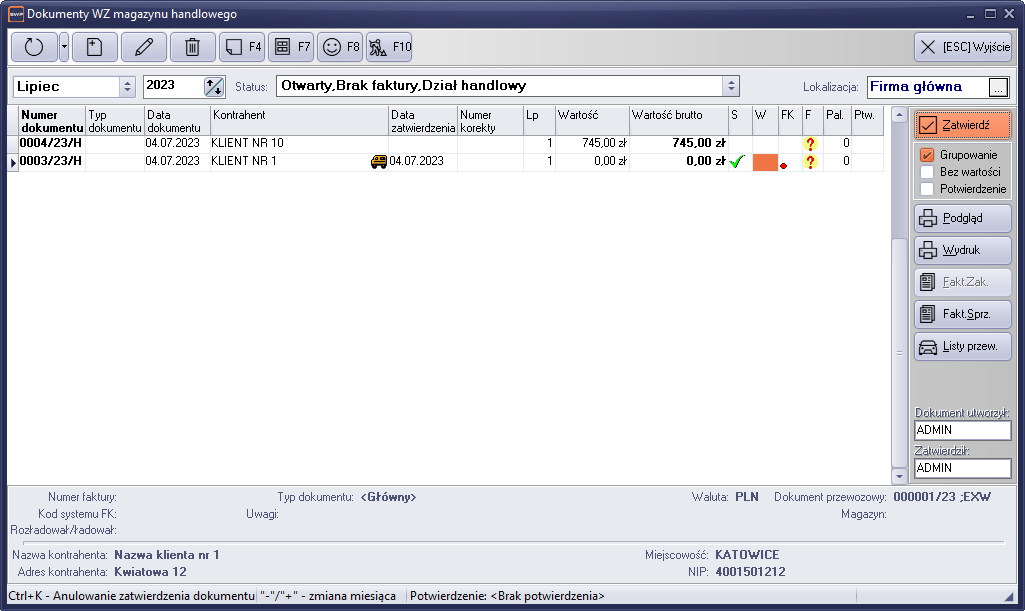 W zależności od uprawnień operatora obsługującego system, wydruk może zawierać lub nie, pola wartości dokumentu. Dodatkowo w panelu umieszczono klawisze umożliwiające otwarcie okna faktur. W przypadku dokumentów wydania z magazynu WZ, będzie aktywny klawisz faktur sprzedaży. Panel posiada również informację o operatorze odpowiedzialnym za dany dokument. Informacja zawiera nazwę operatora. Pełną informację można uzyskać naprowadzając wskaźnikiem myszy na pole informacji.