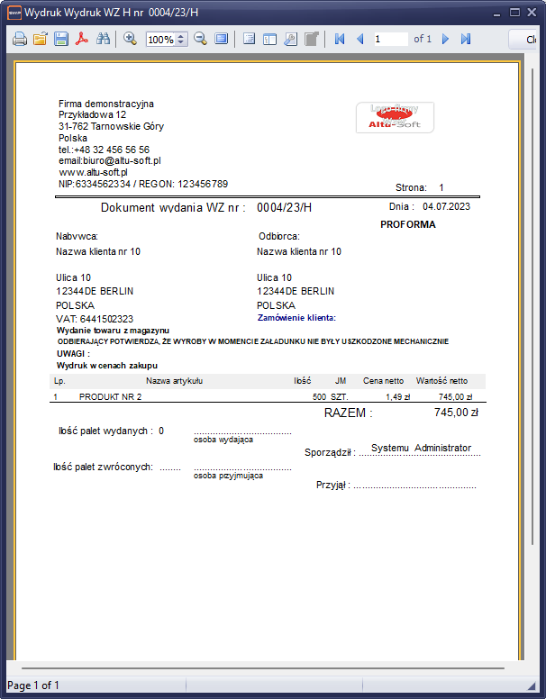 Rysunek 211 Przykładowy wydruk dokumentu WZ