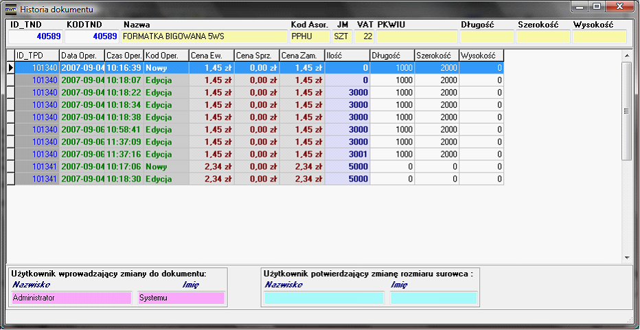 Podczas dokonywania operacji dodawania, edycji lub kasowania pozycji, system automatycznie rejestruje zdarzenia z tym związane. Wykonane zmiany, można przeglądać dzięki funkcji „Historii dokumentu”.