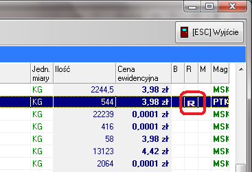 - Tryb z czytnikiem umożliwia dodawanie pozycji do dokumentu przy pomocy czytnika kodów paskowych. Podczas dodawania pozycji do dokumentu generowane jest automatycznie przez system wydruk etykiety towaru. Tryb ten wykorzystywany jest do obsługi pakietów PKT. Jeśli dokument pracuje w trybie z czytnikiem w kolumnie "...", widoczny jest odpowiedni symbol (praca w trybie z czytnikiem opisana została w rozdziale "Produkcja w toku").