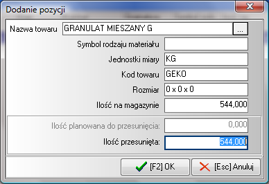 W trakcie dodawania nowej pozycji, należy z listy towarów znajdujących się na stanie magazynowym, wybrać interesujący nas towar i określić w jakiej ilości ma być wykonane przesunięcie.