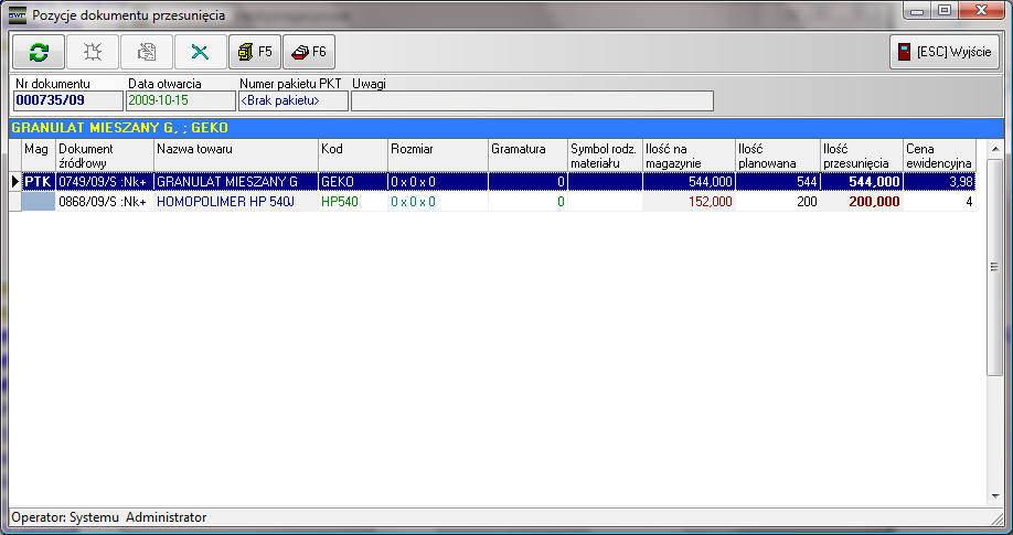 Rysunek 290 Lista pozycji dokumentu przesunięcia