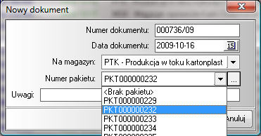 Jeśli wybierzemy pod-magazyn obsługujący pakiet PKT (opcja magazynu "Łączenie dokumentów w pakiety PKT"), wtedy system umożliwi nam wybór istniejącego pakietu PKT lub utworzenie nowego, przy pomocy klawisza z prawej strony pola "Numer pakietu:"