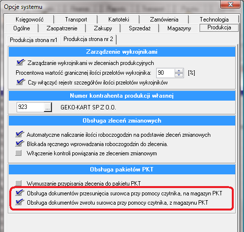 Łączenie dokumentów w pakiety PKT - włączenie parametru spowoduje, że dokumenty typu Zlecenia produkcyjne, dokumenty przesunięć pomiędzy magazynemi oraz dokumenty rozliczeniowe pakietu PKT, będą połączone w grupę oznaczoną danym numerem pakietu PKT.