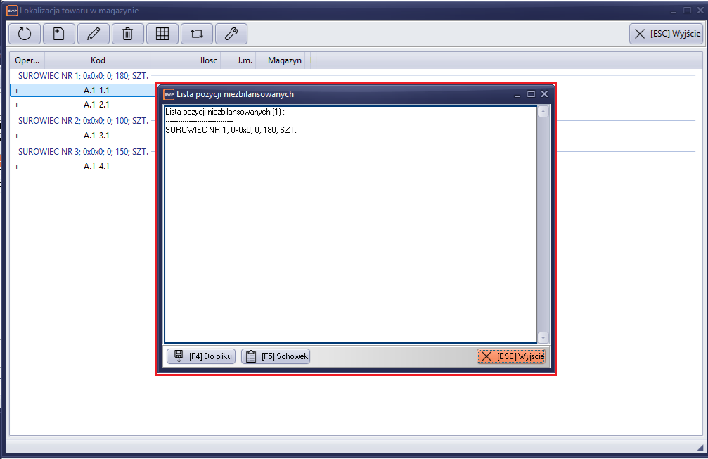 Mechanizm testowania, umożliwia bieżący podgląd bilansu kodów lokalizacji i pozycji dokumentu. W przypadku braku bilansu, zostanie wyświetlona lista pozycji, dla której występuje rozbieżność pomiędzy ilością towaru w dokumencie i ilością przypisanych kodów lokalizacji.