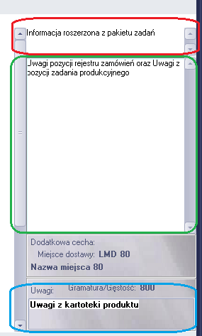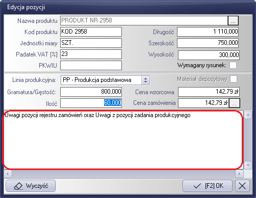 W przypadku informacji dodanej w nagłówku pakietu zadań produkcyjnych, w prawym górnym rogu panelu pozycji zamówienia, pojawi się odpowiednia informacja (czerwony prostokąt).
