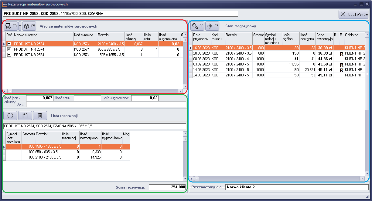 W formularzu wyodrębniono trzy podstawowe sektory. Pierwszy (czerwony) to lista towarów wzorcowych zdefiniowanych w strukturze produkcyjnej produktu. Na podstawie tej listy w sektorze niebieskim, widzimy stan magazynowy odpowiadający towarowi ze wzorca produktu. Trzeci sektor, zielony to lista rezerwacji towaru dla pozycji zamówienia.