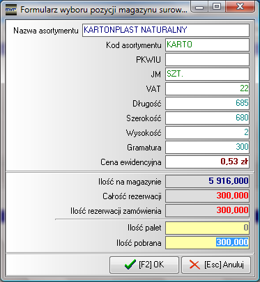 W przypadku gdy w liście istnieje kilka pozycji surowcowych o tych samych parametrach, w liście pojawi się więcej rekordów. Następnym krokiem, który należy wykonać będzie wybranie odpowiedniej pozycji i zatwierdzenie klawiszem "Enter"