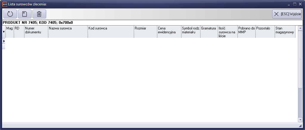 Po przypisaniu wszystkich surowców, możemy powrócić do okna do listy surowców zlecenia.
