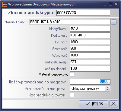 Jeśli zlecenie posiada więcej niż jeden produkt, to przy pomocy klawisza z lewej strony pola „Nazwa towaru”, można wybrać odpowiedni produkt i następnie wprowadzić ilość przeznaczoną do wprowadzenia na magazyn handlowy.