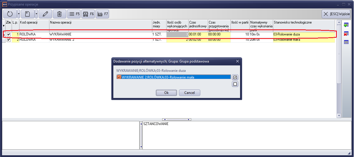 Po przypisaniu, operacja główna podświetlona jest kolorem zielonym. Operacje alternatywne posiadają ten sam numer operacji i oznaczone są kolorem niebieskim.