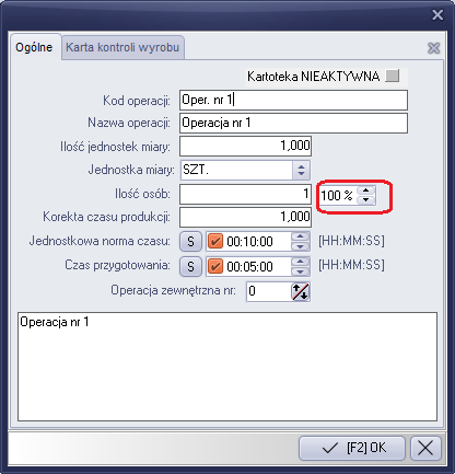 Rysunek 546Wskaźnik korekty wydajności w oknie edycji operacji przypisanych do technologii