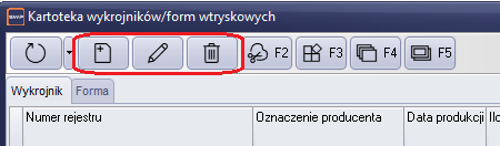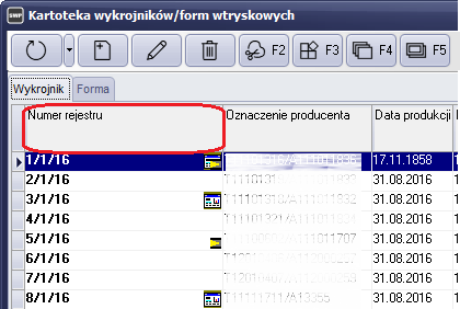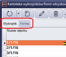 Zmianę rodzaju przeglądanych pozycji rejestru wykonujemy poprzez kliknięcie na zakładkę "Wykrojnik / forma"