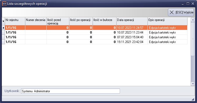 W liście znajdziemy takie informacje jak, wspomniany numer zlecenia podczas operacji zatwierdzania zlecenia, ilość przelotów wykrojnika przed i po operacji oraz zawartość bufora przy operacjach w oddziale. Dodatkowo system rejestruje kto i kiedy wykonał daną operacje.