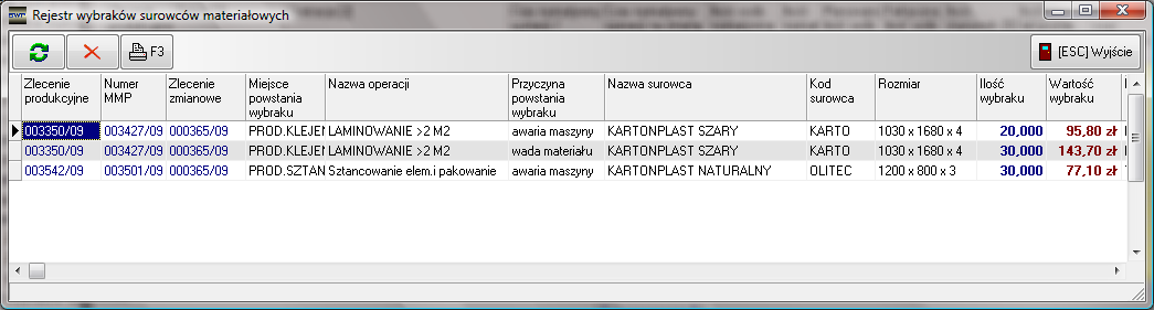 W podglądzie widoczne są wszystkie pozycje zarejestrowane dla danego zlecenia zmianowego. Dodatkowo system automatycznie wylicza wartość wybraku. Wartość wybraku obliczana jest na postawie ceny ewidencyjnej surowca i ilości wybrakowanej.