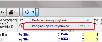 Podgląd wprowadzonych pozycji wybraków do danego zlecenia zmianowego, dostępny jest z poziomu menu kontekstowego klawisza [F9]. Po otwarci menu wybieramy opcję "Podgląd rejestru wybraków"