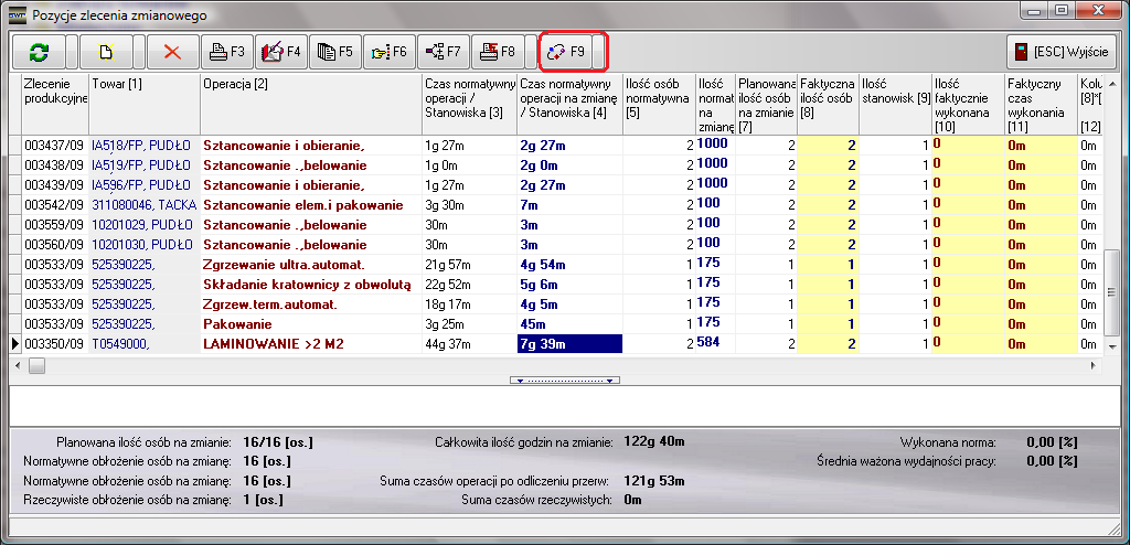 Mechanizm został dodany do okna pozycji zleceń zmianowych. W pasku narzędzi okna dostępny jest klawisz "F9". Klawisz służy do otwarcia formularz rejestracji wybraku.