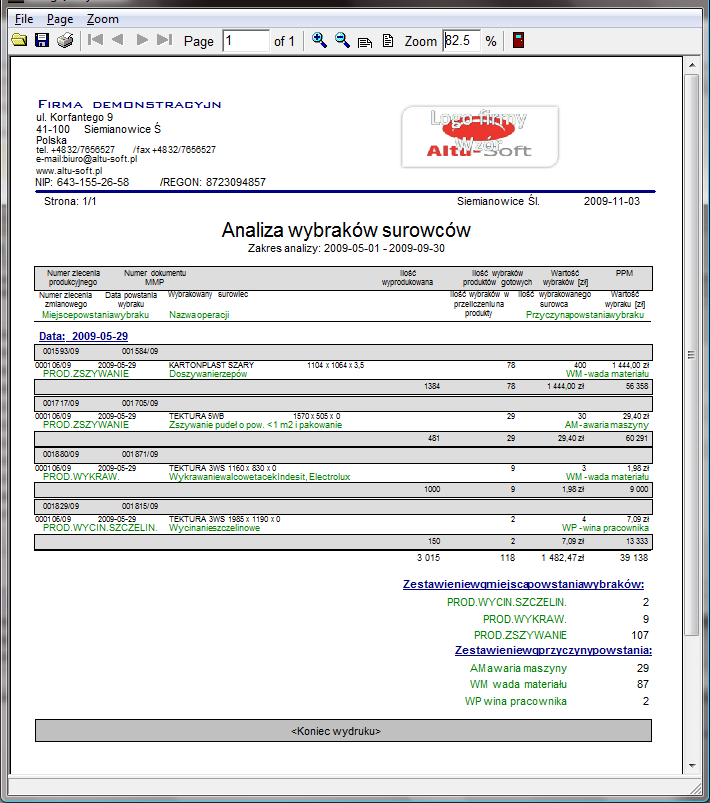 Wydruk podzielony został na trzy części . Pierwsza zawiera listę wybraków pogrupowaną wg zleceń produkcyjnych. Część druga to zestawienie wg miejsca powstania wybraków. Trzecia, to zestawienie wg przyczyny powstania wybraków. Ilości wybraków produktów gotowych, zostały wyliczone na podstawie wartości wybraku i ceny jednostkowej produktu gotowego.