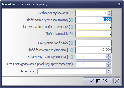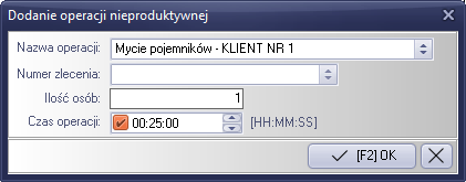 Wybieramy operację z biblioteki operacji nieproduktywnych, ilości osób które będą wykonywały operację oraz czas wykonywania operacji. Po wypełnieniu pól zatwierdzamy klawiszem "[F2] OK"