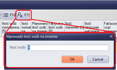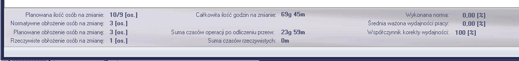 "Planowana ilość osób na zmianie" - Jest to ilość zdefiniowana w nagłówku dokumentu w polu "Ilość osób na zmianie". Ilość ta jest "łamana", przez faktyczną ilość osób, którą można zmodyfikować w sposób opisany powyżej. Faktyczna ilość osób brana jest pod uwagę przy obliczeniach średniej wydajności zmiany i wykonanej normy.