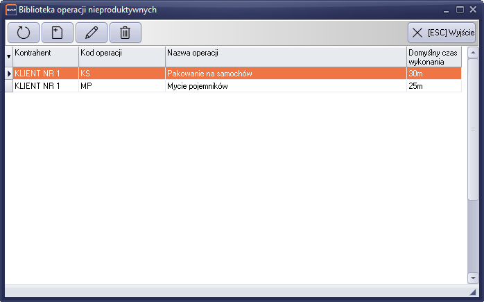Pracę z operacjami nieproduktywnymi, należy rozpocząć od definicji operacji w bibliotece. Biblioteka znajduje się w sekcji Produkcja->Zlecenia zmianowe-> Biblioteka operacji nieprodukcyjnymi.