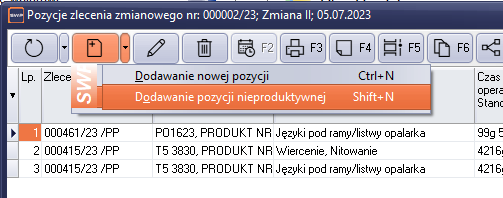 Wprowadzanie operacji nieproduktywnej do zlecenia zmianowego możemy wykonać na dwa sposoby. Po otwarciu okna pozycji dokumentu zlecenia zmianowego, operację można dodać przy pomocy skrótu klawiszowego Shift+N, lub przy pomocy menu kontekstowego klawisza "Nowa pozycja".