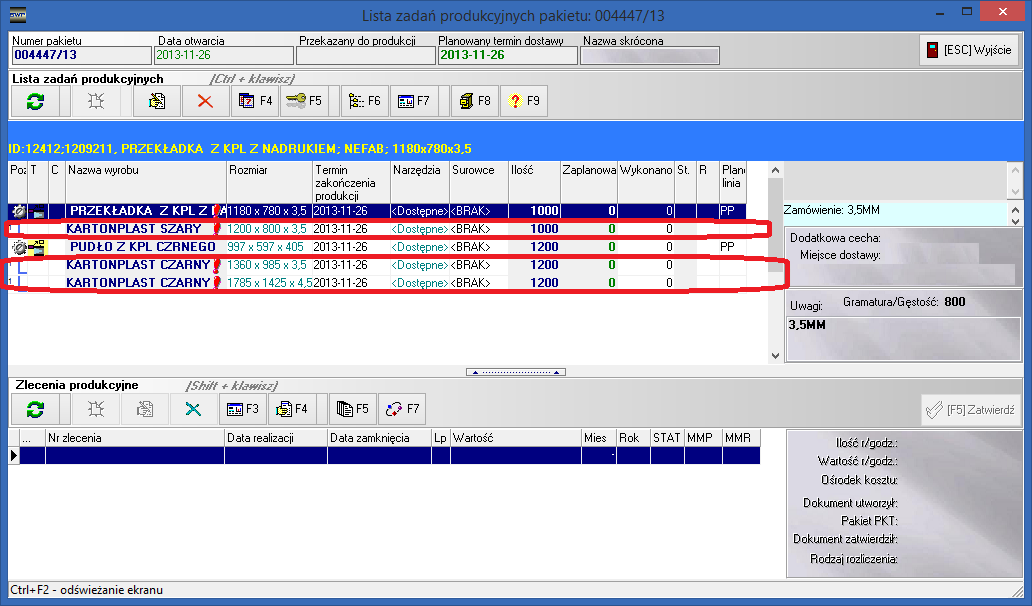 5. Końcowym efektem działania mechanizmu, jest pominięcie etapu zatwierdzania pozycji w oknie listy pozycji zapotrzebowanych i utworzenie pozycji zadań produkcyjnych w pakiecie produkcyjnym rys. 4.