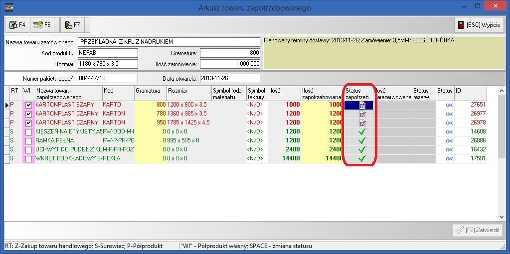 4. Po zatwierdzeniu zapotrzebowania i uruchomieniu klawisza zapisu [F2 Zatwierdź], dla wszystkich pozycji półproduktowych (z zaznaczonym wskaźnikiem "Wl"), zostaną automatycznie wygenerowane pozycja zadań produkcyjnego w pakiecie głównym (efektem działania mechanizmu w arkuszu zapotrzebowań jest odpowiednia ikonka w kolumnie statusu zapotrzebowania rys. 3).