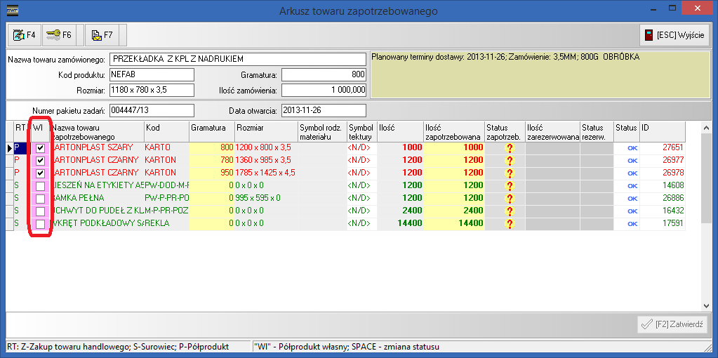 2. Po przejściu procedury wyboru wzorców, generowana jest lista zapotrzebowań. W arkuszu zapotrzebowań widać zaznaczoną opcję "półproduktu własnego" (kolumna "Wl" rys. 2.)