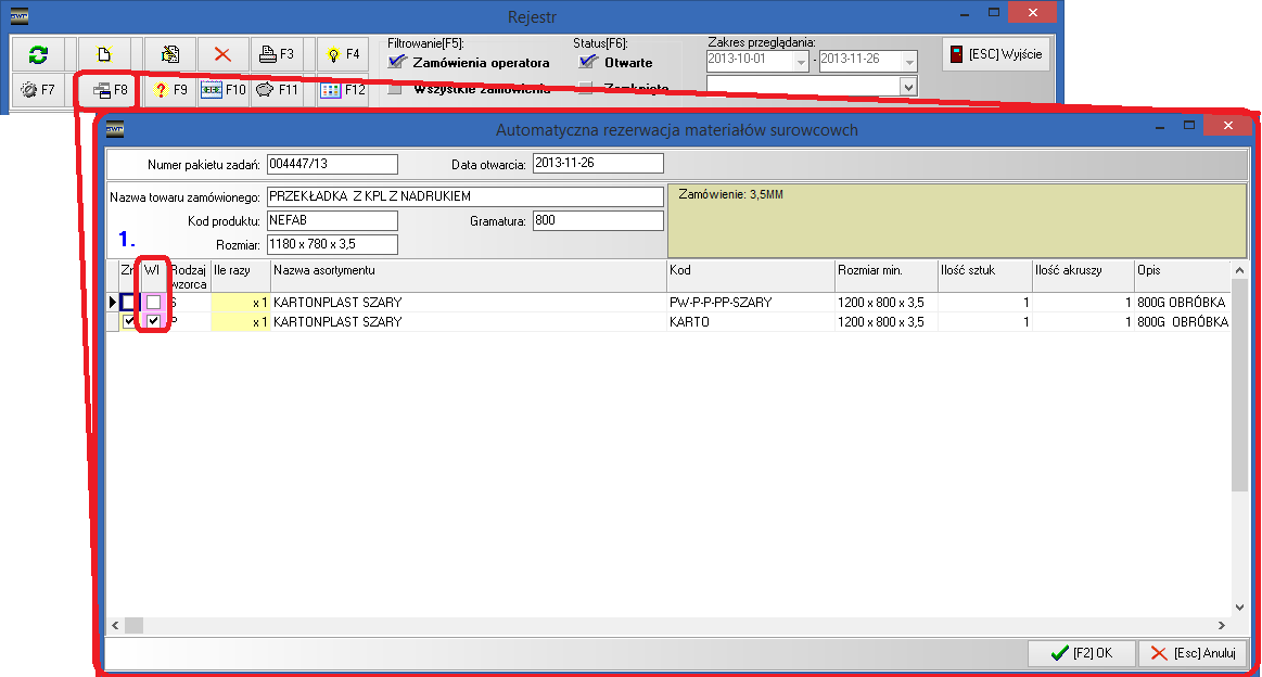 1. Podczas generowania zamówienia na surowce do działu zakupów, z poziomu zamówienia handlowego [klawisz F8]. W kolumnie "Wl" zaznaczamy znacznik dla wzorców półproduktowych, dla których chcemy generować zadanie produkcyjne rys 1.