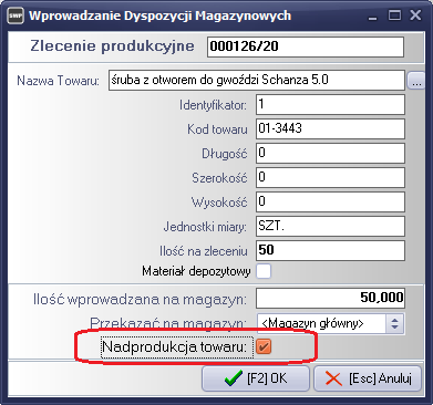 Podczas tworzenia dyspozycji magazynowej, możliwe jest oznaczenie danej dyspozycji jako nadprodukcja. W takim przypadku produkt lub półprodukt zostanie automatycznie przeniesiony na stan magazynowy bezpośrednio już jako produkcja własna.