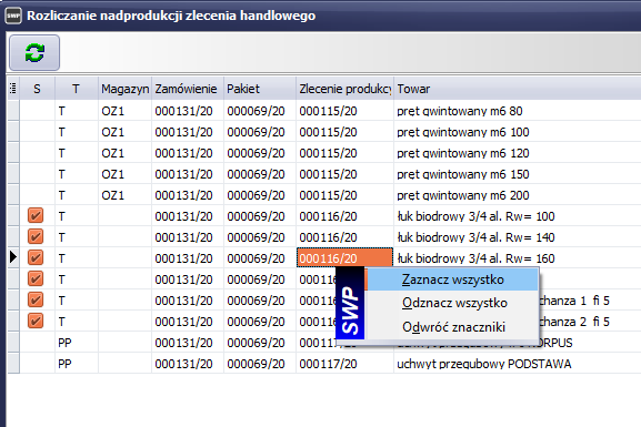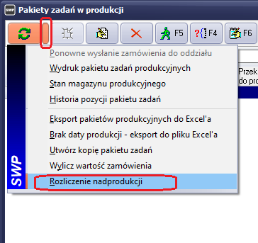 Uruchomienie mechanizmu rozliczenia nadprodukcji, możliwy jest również bezpośrednio z poziomu okna dokumentów zamówień handlowych lub okna pakietów produkcyjnych. Z poziomu okna zamówień handlowych, system analizuje wszystkie pakiety zadań produkcyjnych należących do zamówienia.