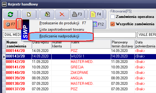 Rysunek 763 Uruchamianie mechanizmu rozliczenia nadprodukcji z poziomu zamówienia handlowego.