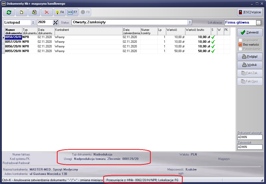 Podobny opis przedstawiony jest o oknie dokumentów Nk+. W stopce widnieje opis na podstawie którego dokumentu rozchodowego Nk- został wygenerowany dokument Nk+.