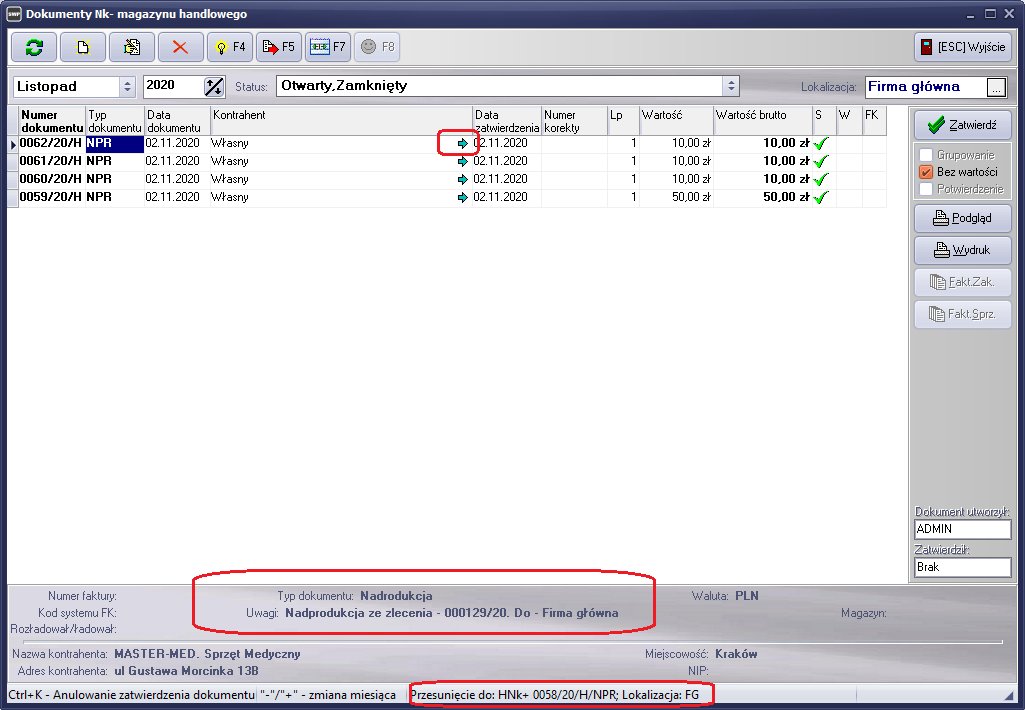 W celu wygenerowania dokumentów należy użyć klawisza "Generuj". Użycie klawisza spowoduje wygenerowanie dokumentów Nk- dla danego zlecenia produkcyjnego oraz sparowanego do niego dokumentu Nk+, w celu wprowadzenia towaru na magazyn jako produkcja własna. Dokumentu będą posiadały typ "NPR", w opisie dokumentu będzie przestawiony numer zlecenia produkcyjnego. Dokumenty w zależności od typu towaru, będą wygenerowane na odpowiednim magazynie. Dla produktów w magazynie handlowym, dla półproduktów w magazynie materiałów surowcowych. Para dokumentów w systemie jest powiązana, można to sprawdzić w odpowiednim miejscu w oknie dokumentów. Poniżej przedstawiono okno dokumentów Nk-. W kolumnie "Kontrahent" uwidoczniona jest strzałka, określająca że do tego dokumentu powiązany jest dokument przychodowy. Numer dokumentu przychodowego Nk+ przedstawiony jest w stopce okna. W opisie dokumentu można odczytać typ dokumentu "Nadprodukcja", oraz w uwagach opis dotyczący z jakiego zlecenia produkcyjnego towar pochodzi.