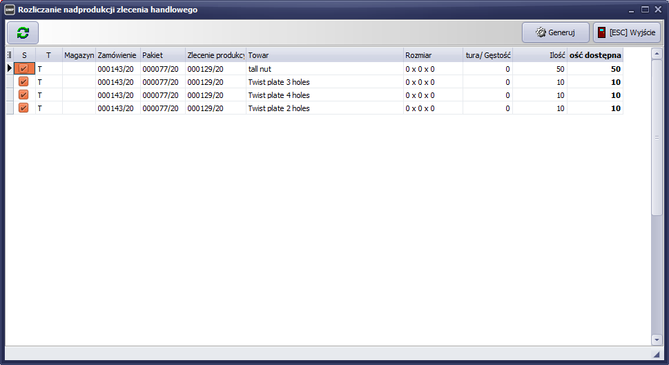 Jeśli pozycja na stanie magazynowym będzie posiadała zdefiniowaną rezerwację, system pokaże ilość pomniejszoną o tą rezerwację w kolumnie "Ilość dostępna". W kolumnie "Ilość", przedstawiona jest cała ilość na stanie magazynowym. Po otwarciu okna wszystkie pozycje będą oznaczone do przekazania jako nadprodukcja (znacznik w kolumnie "S"). Znacznik kolumny "S", można dowolnie ustawić przy pomocy lewego klawisza myszy, lub klawisza "spacja". Kolumna "T", przedstawia opis typu towaru, "T" - produkt, "PP"- półprodukt.
