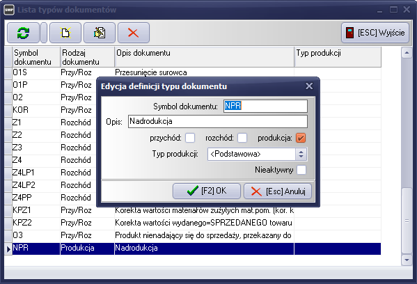 Po otwarciu okna typów dokumentów definiujemy nowy typ dokumentu magazynowego "NPR" - nadprodukcja.