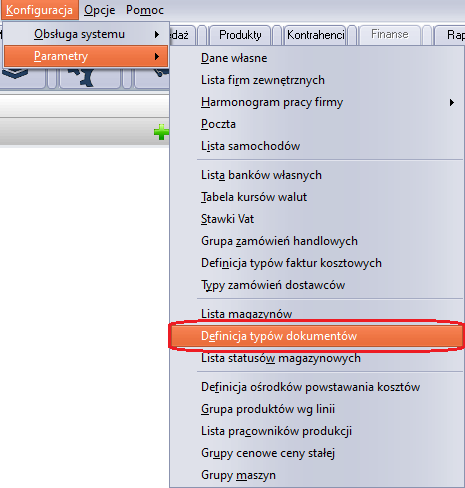 Konfigurację typu wykonujemy w menu podręcznym," Konfiguracja->Parametry->Definicja typów dokumentów".